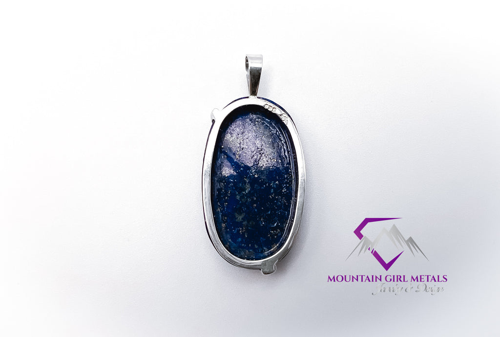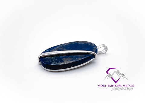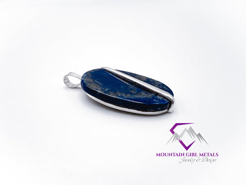 Adorn yourself with the captivating beauty of this handcrafted sterling silver pendant featuring a stunning oval lapis lazuli stone. The rich, deep blue of the lapis, often flecked with natural pyrite inclusions that sparkle like stars, is elegantly secured by a gracefully flowing sterling silver accent, creating a unique and sophisticated design. This artisan piece is perfect for adding a touch of timeless elegance to any outfit.