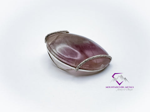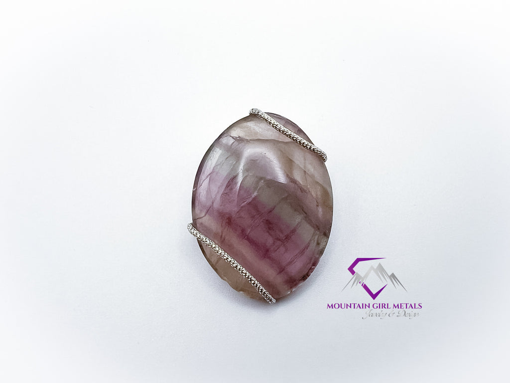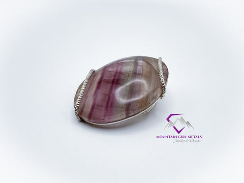 Capture the beauty of the earth with this stunning, one-of-a-kind pendant featuring a striking piece of banded fluorite, elegantly secured in a handcrafted sterling silver setting. The elongated, polished stone showcases natural bands of rich purples, soft lilacs, pastel greens, and subtle tans, making it a captivating centerpiece.