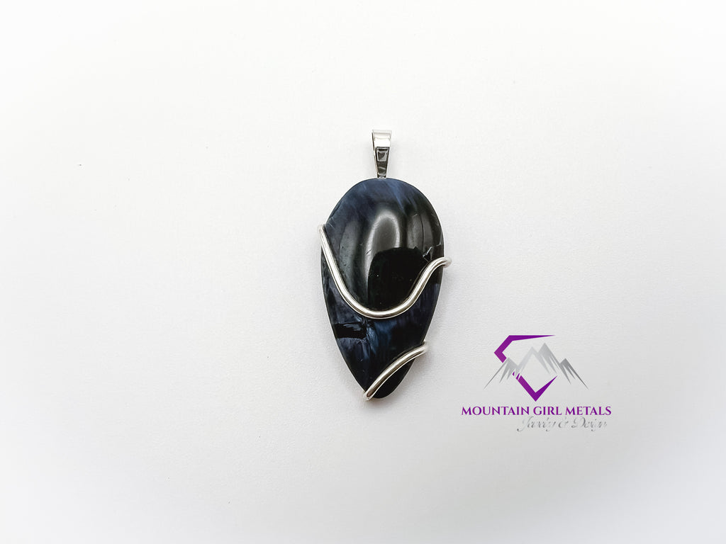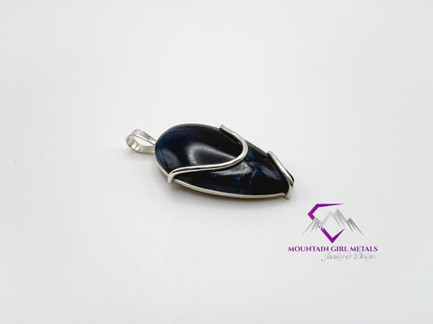 This handcrafted pendant showcases a beautiful, polished cabochon of dark blue and black Pietersite. The stone's famous chaotic chatoyancy—a silky, shimmering effect—is clearly visible, appearing as vibrant swirls and flashes of blue, gold, and gray across its surface. The organic shape of the stone is enhanced by a sleek, curved structure of sterling silver that cradles the gem.