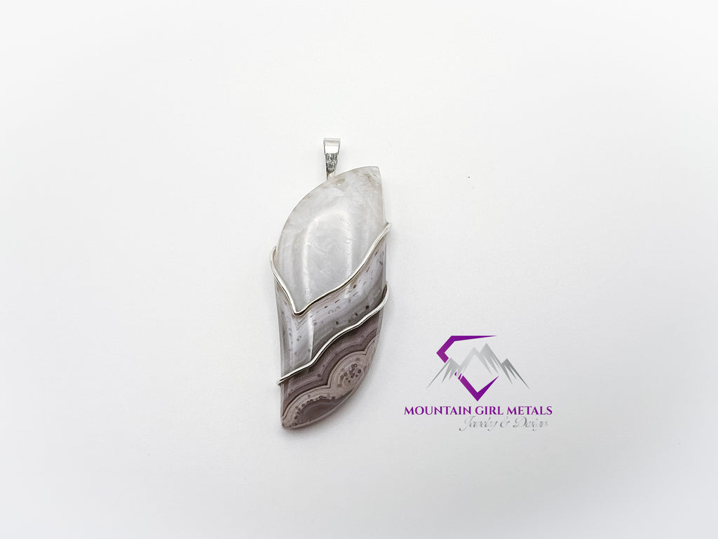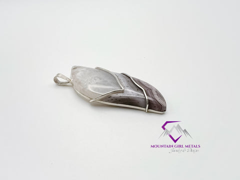 This elegant pendant features a stunning, free-form slab of natural Purple Passion Agate, showcasing its beautiful lace-like bands of white, soft lavender, and deep purple hues. The stone is meticulously secured by an artistic setting of solid Sterling Silver (.925), which flows gracefully around the agate’s organic shape and highlights its unique color pattern.