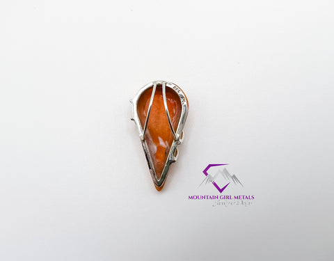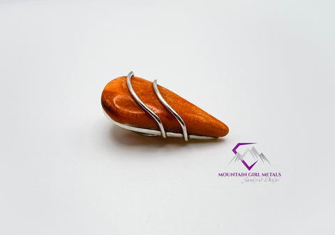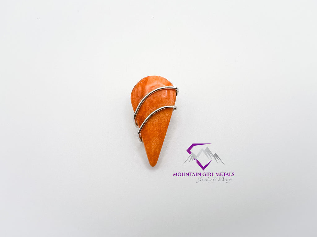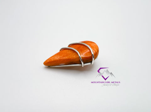 This unique pendant features a vibrant, teardrop-shaped Spiny Oyster shell set in a sleek, custom Sterling Silver harness. The rich, natural orange hue of the shell is beautifully complemented by the bright, clean lines of the silver, creating a striking piece of wearable art. Perfect for adding a pop of natural color to any outfit.