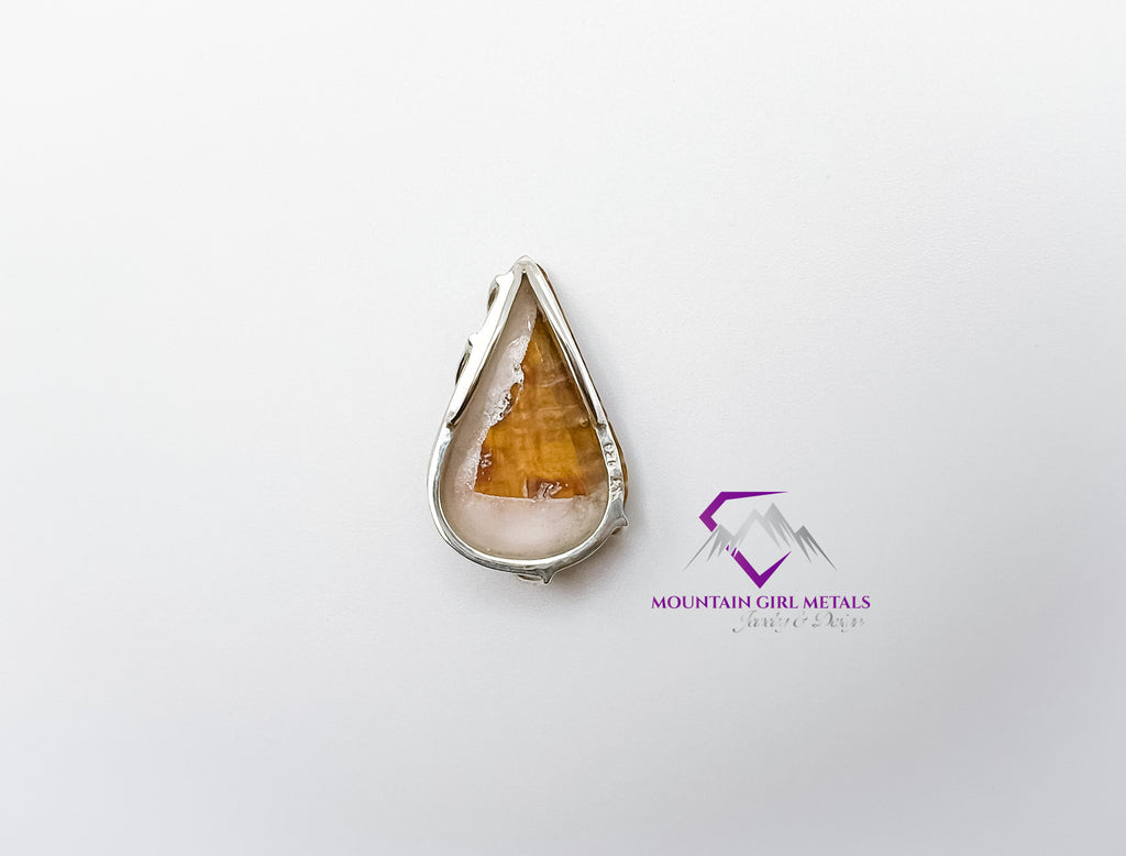 The beautiful material used in this pendant is not a typical stone, but rather the shell of a type of saltwater clam called the Spiny Oyster, belonging to the Spondylus genus.