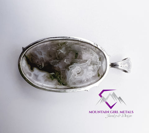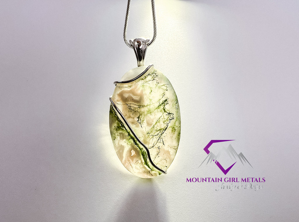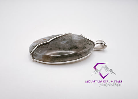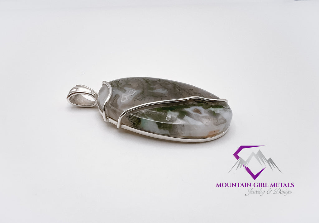 Add a touch of nature's artistry to your collection with this exquisite sterling silver pendant featuring a stunning tree moss agate. This unique piece showcases the organic beauty of the gemstone, highlighted by a graceful silver setting.