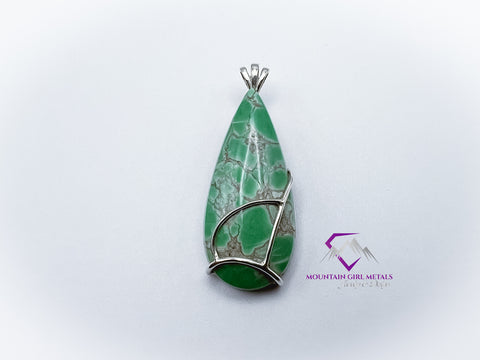 This pendant showcases the intense, natural green of the variscite, framed by a unique, organic sterling silver element that secures the stone and highlights its beautiful teardrop shape. The flowing, architectural lines of the silver framework perfectly complement the natural patterns of the stone, creating a modern, one-of-a-kind piece.