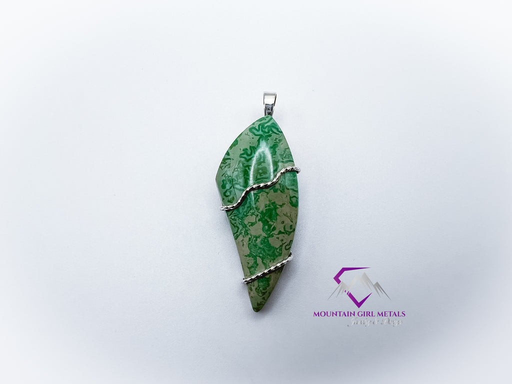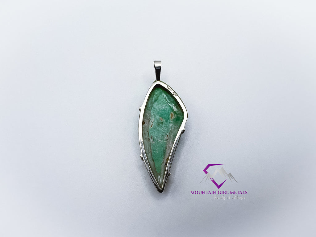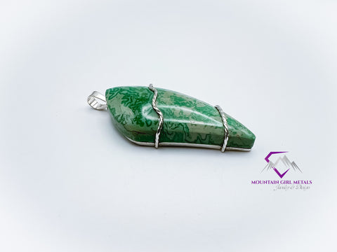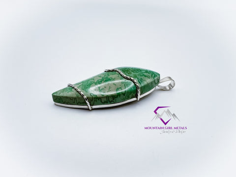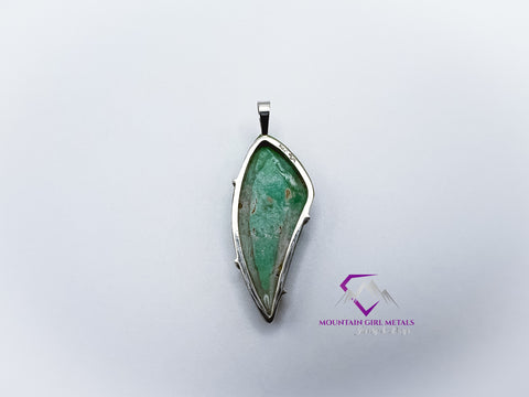 This one-of-a-kind pendant features a stunning piece of natural variscite, showcasing a beautiful blend of deep and pale greens with intricate patterning. The stone's freeform, elongated shield shape gives it a modern, organic feel. It is held securely by a clean, minimalist design using solid sterling silver (.925), which highlights the gem's natural beauty without overshadowing it. This elegant piece is finished with a simple sterling silver bail, ready to be slipped onto your favorite chain.
